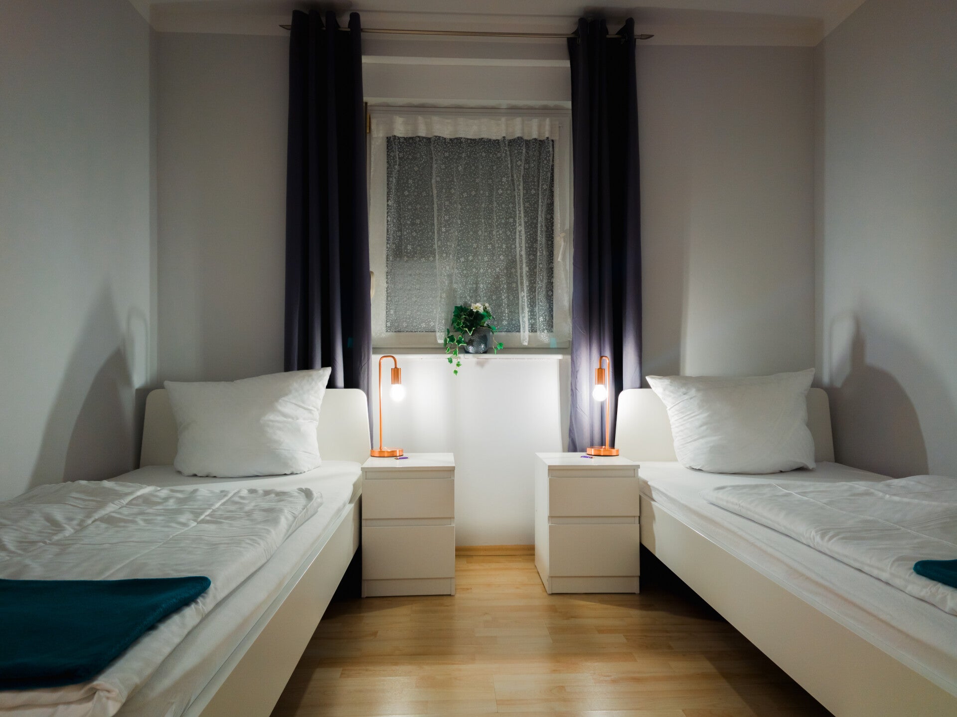 Unser Schlafzimmer ist der perfekte Rückzugsort für Ihre Entspannung. Es bietet zwei gemütliche Einzelbetten mit bequemen Matratzen, die für einen erholsamen Schlaf sorgen. Neben den Betten befinden sich praktische Nachtschränke, auf denen Sie persönliche Gegenstände ablegen können. Eine moderne Kommode bietet zusätzlichen Stauraum für Ihre Kleidung, während die Kleiderstange mit Bügeln eine ordentliche Aufbewahrung Ihrer Outfits ermöglicht. Für Unterhaltung sorgt ein Smart TV, der Ihnen Zugriff auf Ihre Lieblingsserien und -Filme bietet. Machen Sie Ihren Aufenthalt so angenehm wie möglich – wir freuen uns auf Sie!