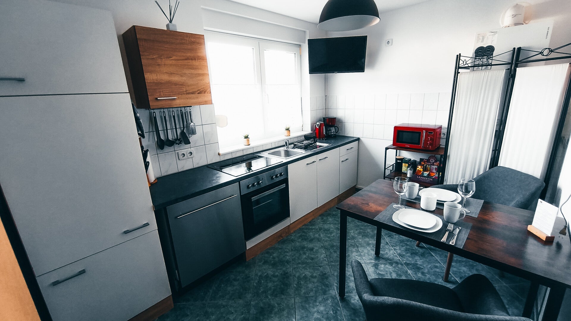 Die voll ausgestattete Küche lässt keine Wünsche offen. Genießen Sie Mahlzeiten im Essbereich mit Tisch und zwei gemütlichen Sesseln, während Sie den Smart-TV nutzen. Zur Ausstattung gehören Ceranfeld mit Backofen, Kühlschrank mit kleinem Tiefkühlfach, Geschirrspüler, Spüle, Senseo- und Kaffeemaschine, Wasserkocher, Toaster und Mikrowelle. Eine umfassende Auswahl an Geschirr, Besteck, Gläsern, Kochgeschirr sowie Kochutensilien ist vorhanden. Für den Start in den Tag stellen wir Kaffee, Kaffeefilter, Kaffeepads und Tee bereit, ebenso wie Grundnahrungsmittel wie Salz, Pfeffer, Mehl, Zucker und Öl. Verbrauchsmaterialien wie Backpapier, Alufolie, Klarsichtfolie, Küchenrolle, Geschirrtücher, Abwaschlappen, Spülmittel, Mülleimer und Geschirrspültabs sind ebenfalls vorhanden.
